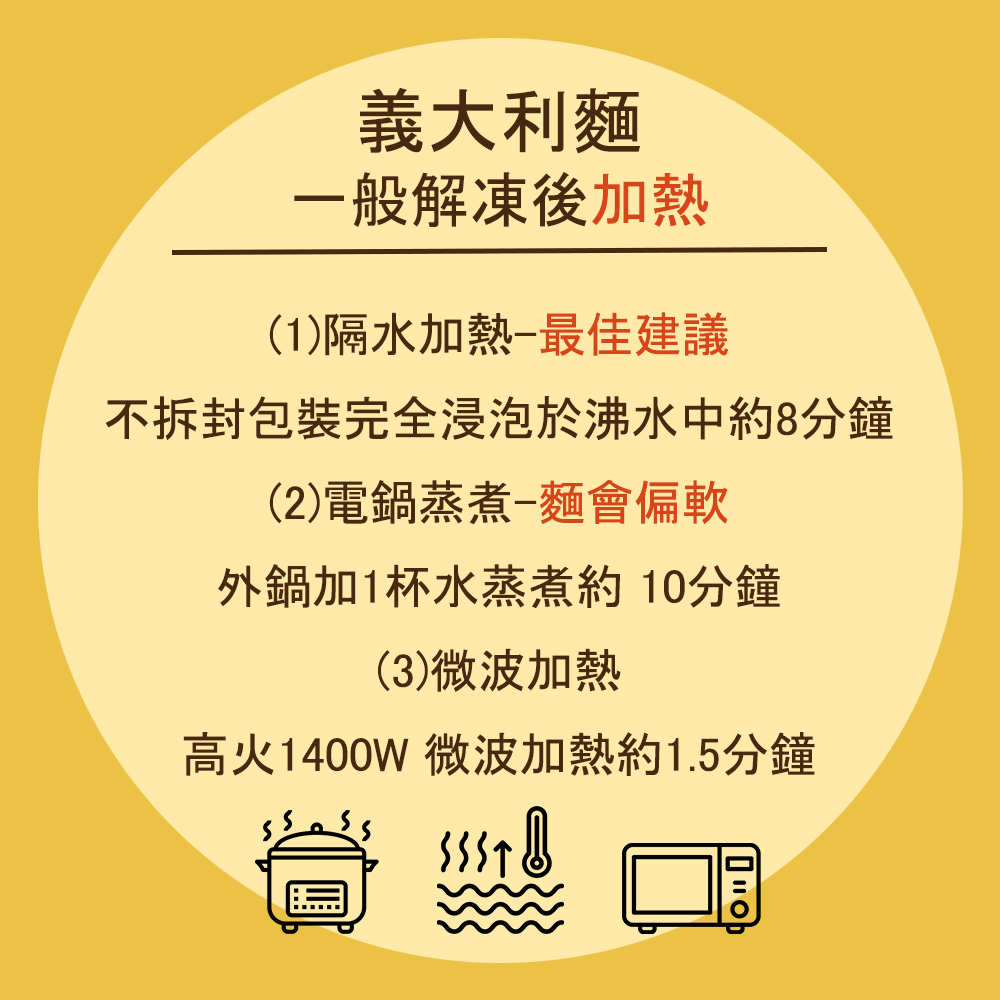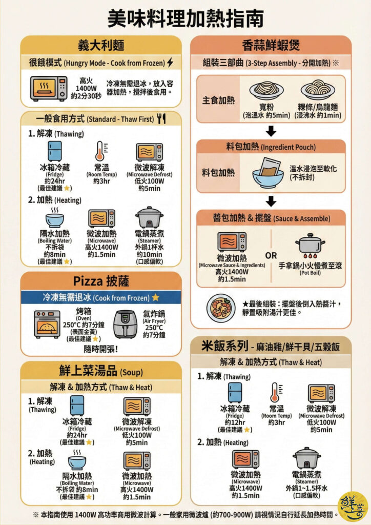 義大利麵 - 解凍 / 加熱方式 披薩 - 加熱方式 油飯/五穀飯 - 解凍 / 加熱方式 香蒜鮮蝦煲 - 解凍 / 加熱方式 湯品 - 解凍 / 加熱方式 客服營業時間12:00~18:00每周二、三公休